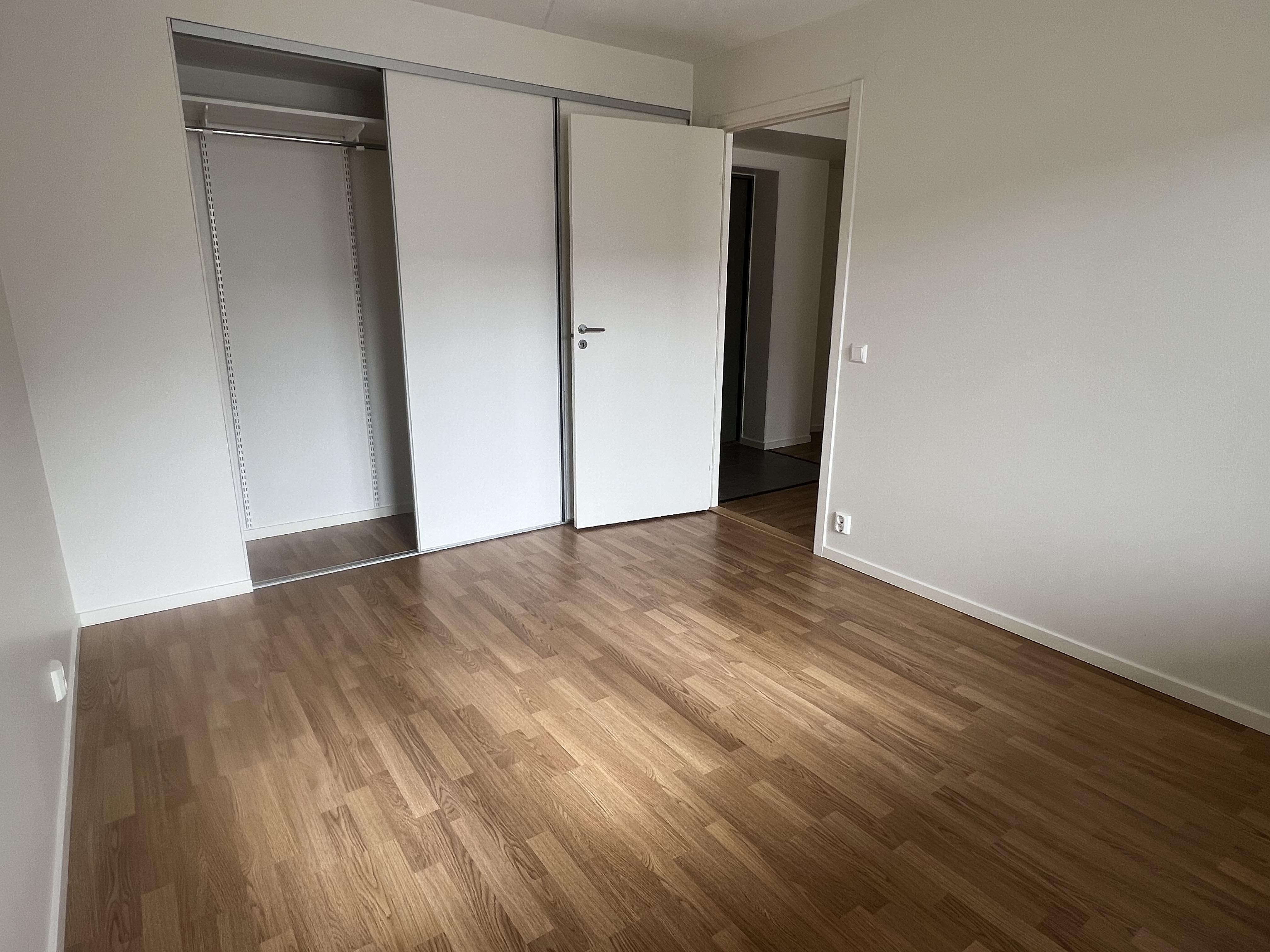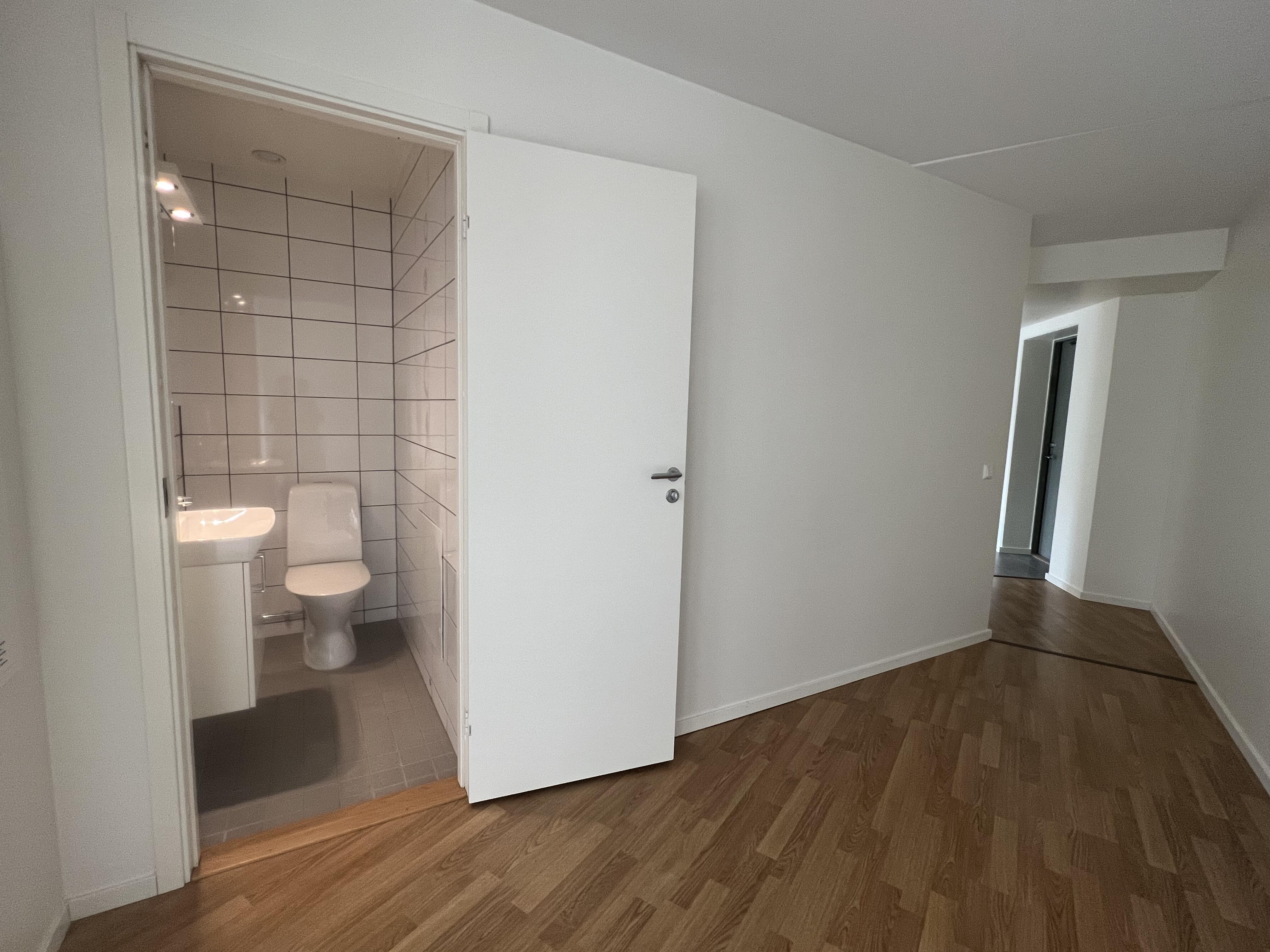 Bostaden rymmer två toaletter: ett helkaklat badrum med både tvättmaskin och torktumlare samt en praktisk gästtoalett – en uppskattad bekvämlighet i vardagen. Båda sovrummen är utrustat med skjutdörrsgarderober för effektiv förvaring.