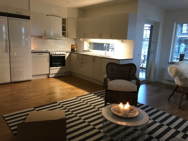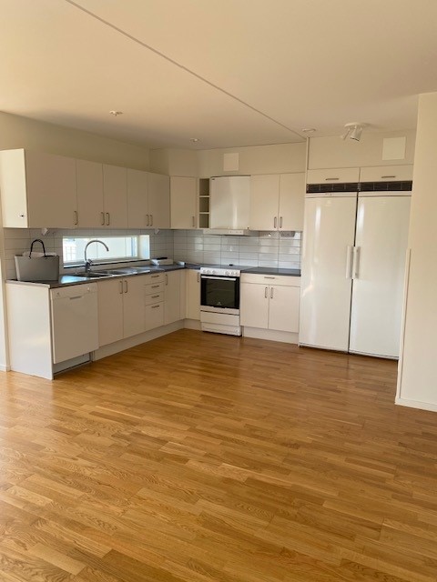 På plan 4 finner vi denna ljusa och fina lägenhet med öppen planlösning och genomgående bra materialval. Bostaden är med sina 70 kvadratmeter fördelat på en rymlig hall med förvaring, ett större och ett mindre sovrum med förvaring. Helkaklat badrum med dusch, tvättmaskin/torktumlare. Kök, matplats och vardagsrum i öppen planlösning, med utgång till stor härlig balkong i nordvästligt läge. Vita släta köksluckor och garderobsdörrar från Marbodal. Lägenheten är utrustad med diskmaskin.