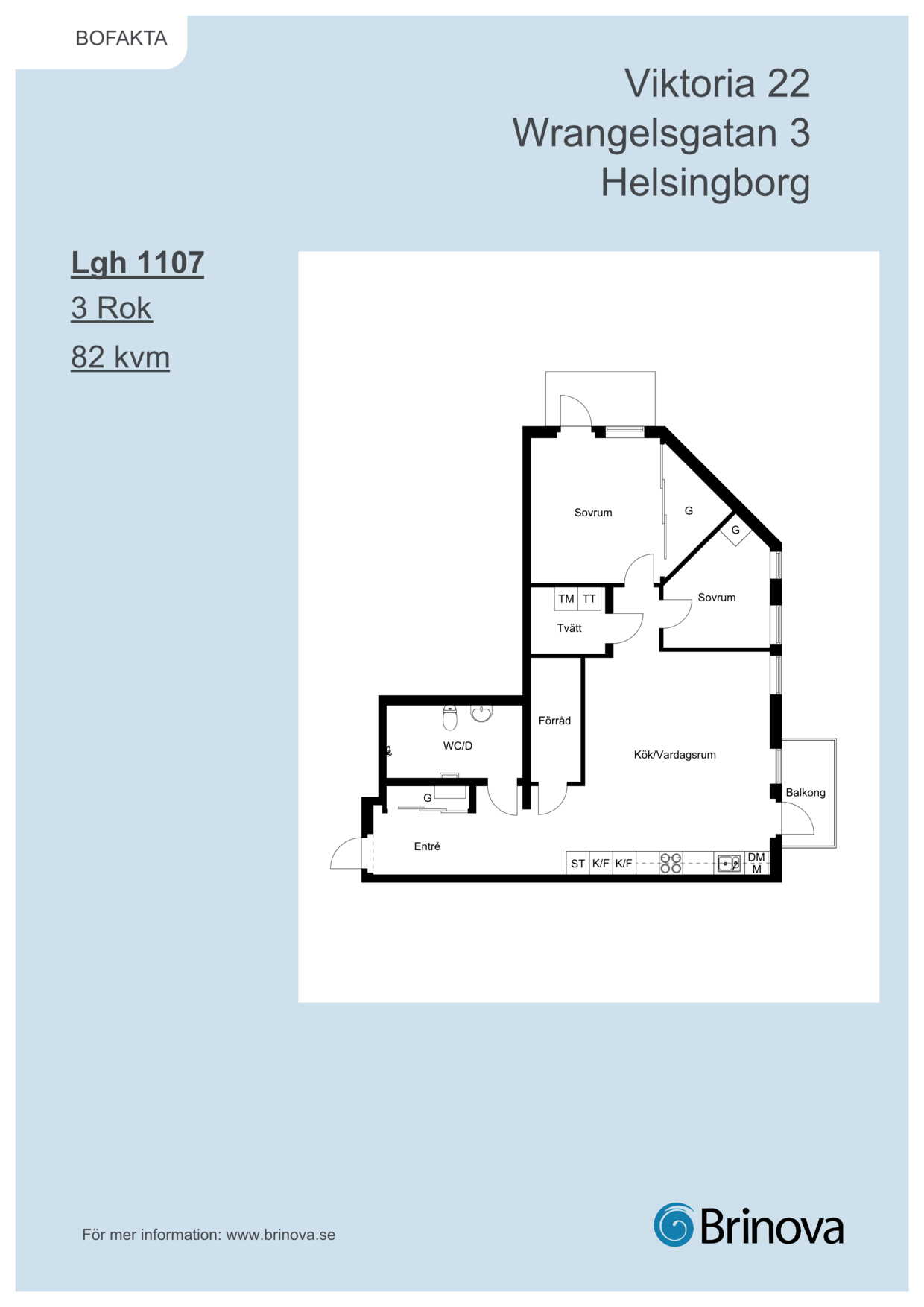 Unik trerummare om 82 kvm på gavelläge med dubbla balkonger, en åt öster och en åt söder. De båda sovrummen ligger samlat och balkongen mot öster nås från det större sovrummet.  Den andra balkongen nås från den inbjudande sällskapsdelen som inrymmer kök och vardagsrum i öppen planlösning. Tvättavdelningen ligger separat från badrum. Invändigt förråd och generöst med förvaring.