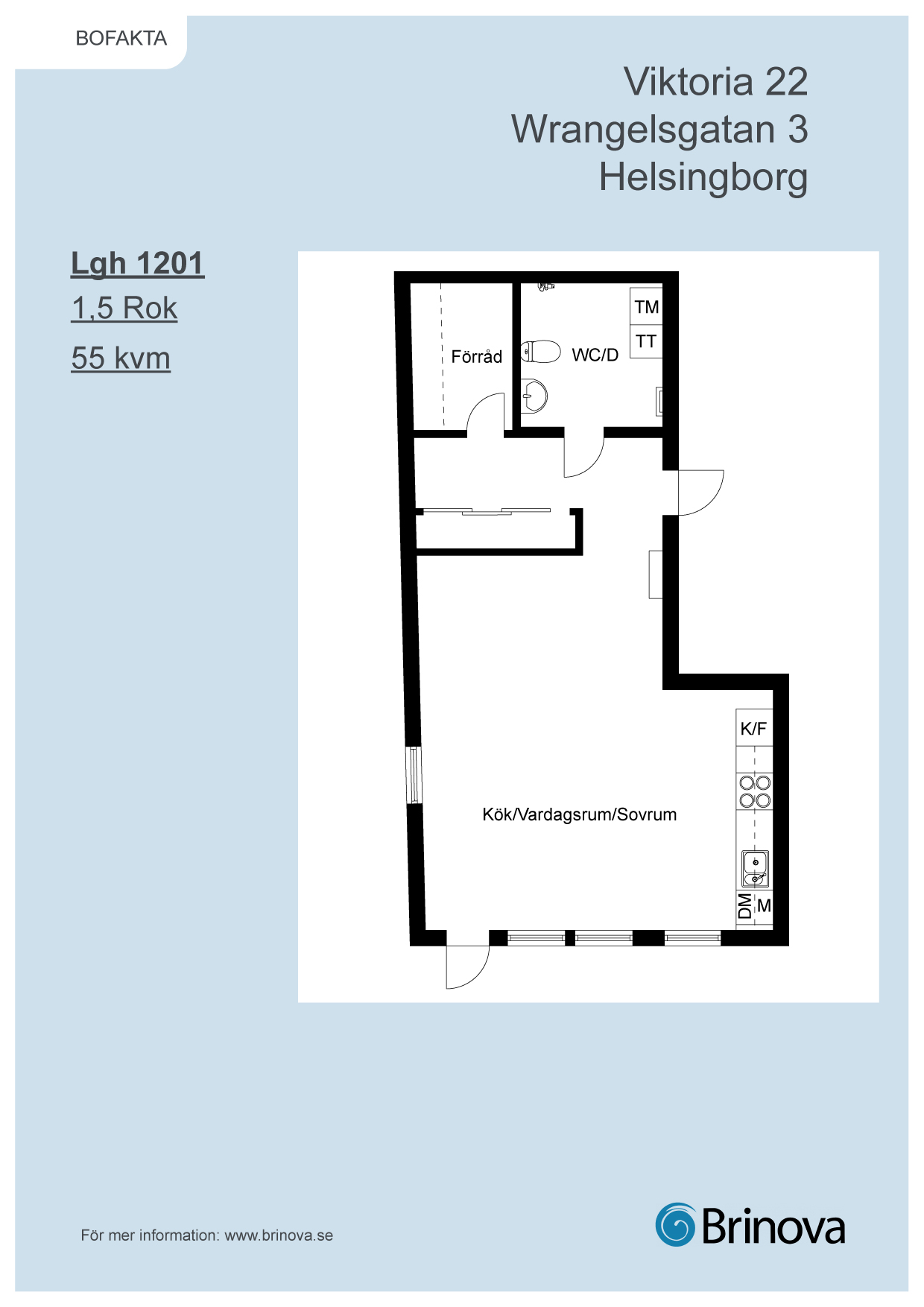 Denna lägenhet med 1,5 rum fördelat på  55 kvm har en öppen och välkomnande planlösning. Härlig balkong i västerläge nås från sällskapsytorna.