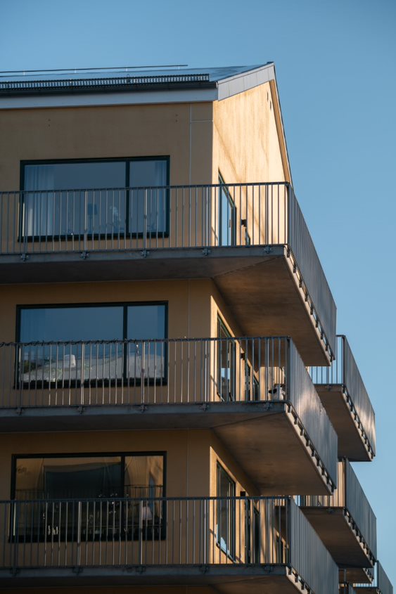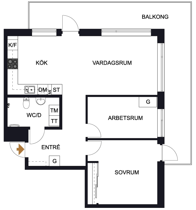 Det helkaklade badrummet är inrett i ljusa toner och utrustat med handfat med kommod, dusch med glasdörrar, handdukstork samt tvättmaskin och torktumlare. Bostaden erbjuder goda förvaringsmöjligheter i form av stora skjutgarderober, och till lägenheten hör även ett rymligt externt förråd i källare eller markplan. Från bostaden nås en stor balkong i vinkel med två utgångar i söder- och västerläge.