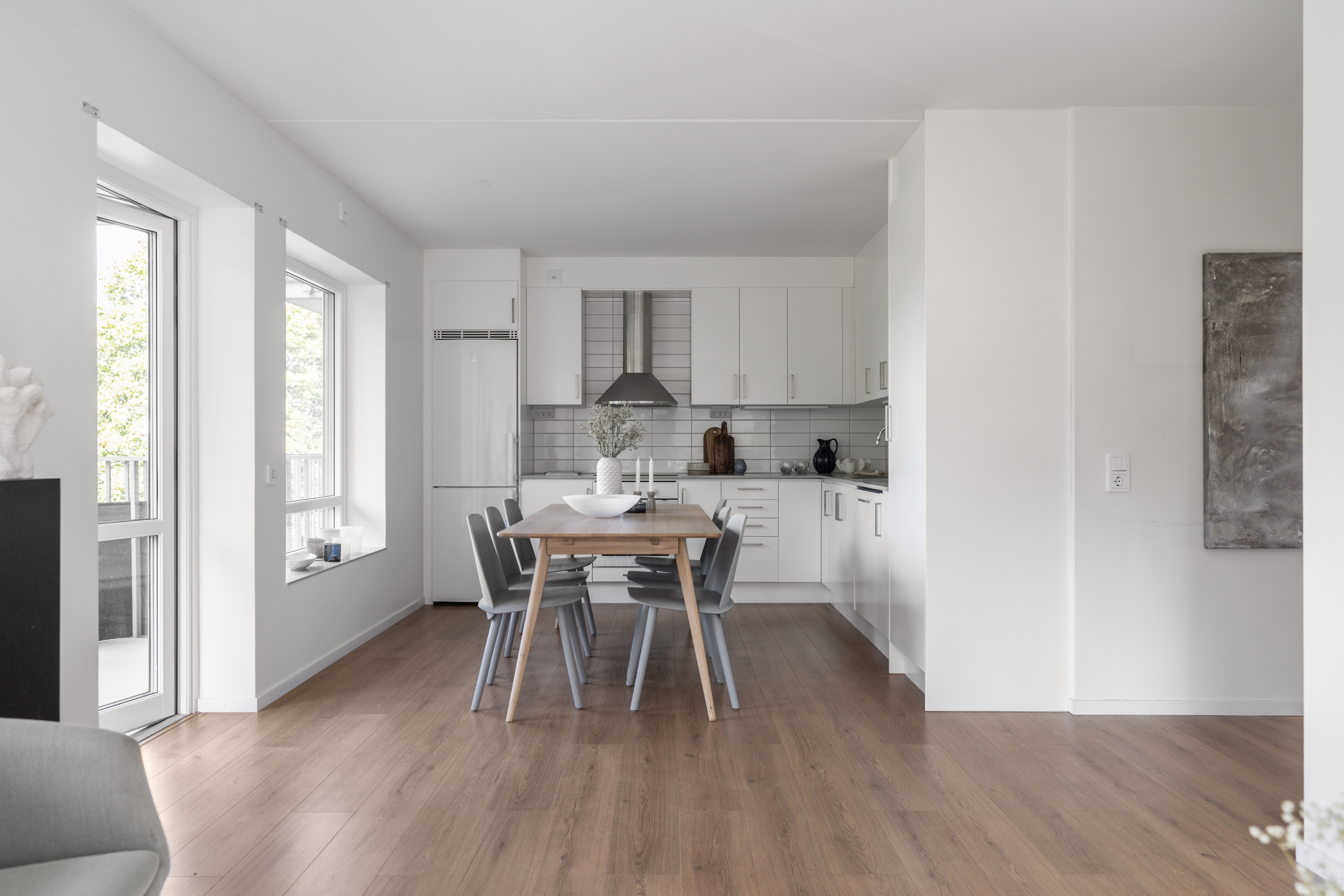 Planlösning Bostaden erbjuder en välplanerad planlösning med två sovrum och en öppen yta mellan kök och vardagsrum som ger en ljus och luftig känsla. Köket från Ballingslöv är utrustat med vita luckor, laminatbänkskiva och plats för matbord. Här finns även kombinerad kyl och frys, integrerad diskmaskin samt inbyggd mikrovågsugn.