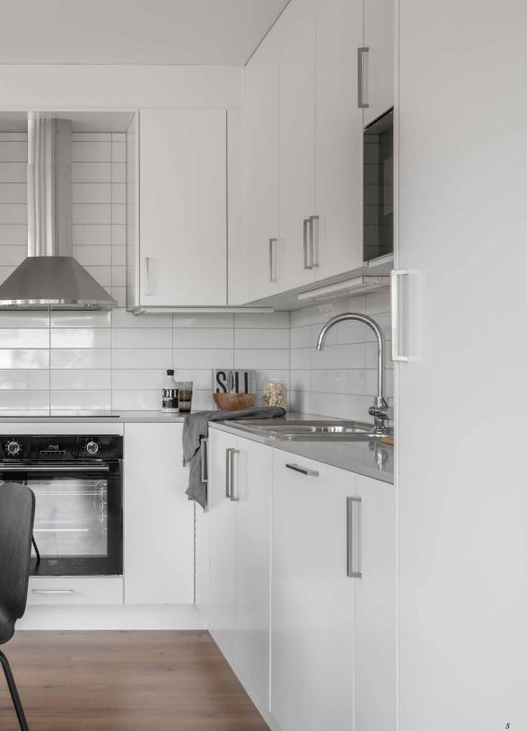 Kök och vardagsrum ligger i öppen planlösning, vilket ger en luftig och social yta. Hela lägenheten är vitmålad och har ett ljust laminatgolv. Ljust sovrum med skjutgarderob. Härifrån nås en stensatt uteplats som skapar en naturlig förlängning av rummet. Det helkaklade badrummet går i beige och grå toner, modernt och stilrent.