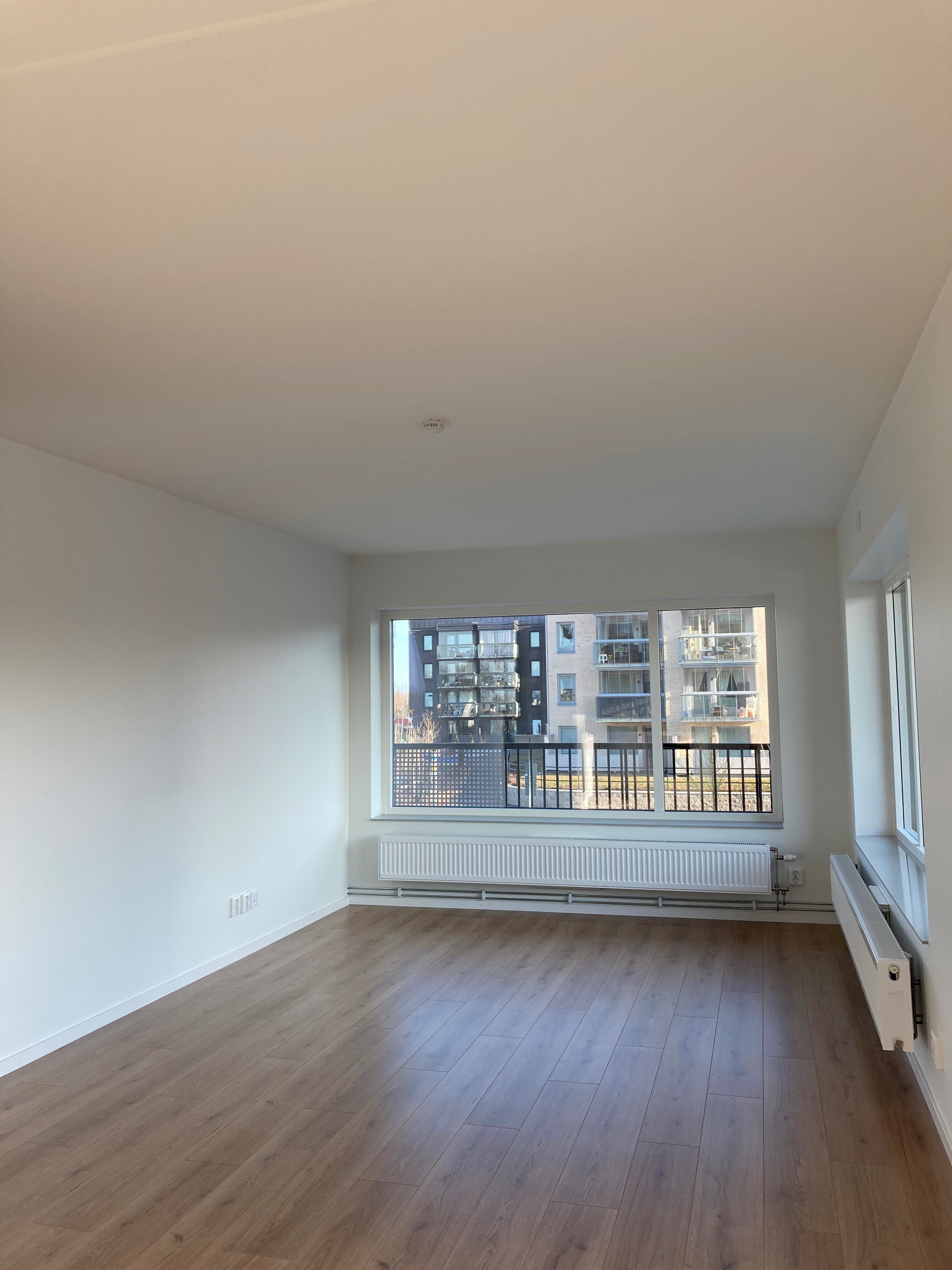 Den öppna planlösningen mellan kök, matplats och vardagsrum skapar en härligt luftig och social atmosfär – perfekt för både vardagsliv och middagar med vänner. Det stilrena köket har vita skåpluckor, elegant grå bänkskiva och integrerad diskmaskin. Det helkaklade badrummet erbjuder extra bekvämlighet med både tvättmaskin och torktumlare. Genomgående ljusa ytskikt och stora fönster ger lägenheten en fräsch och modern känsla.