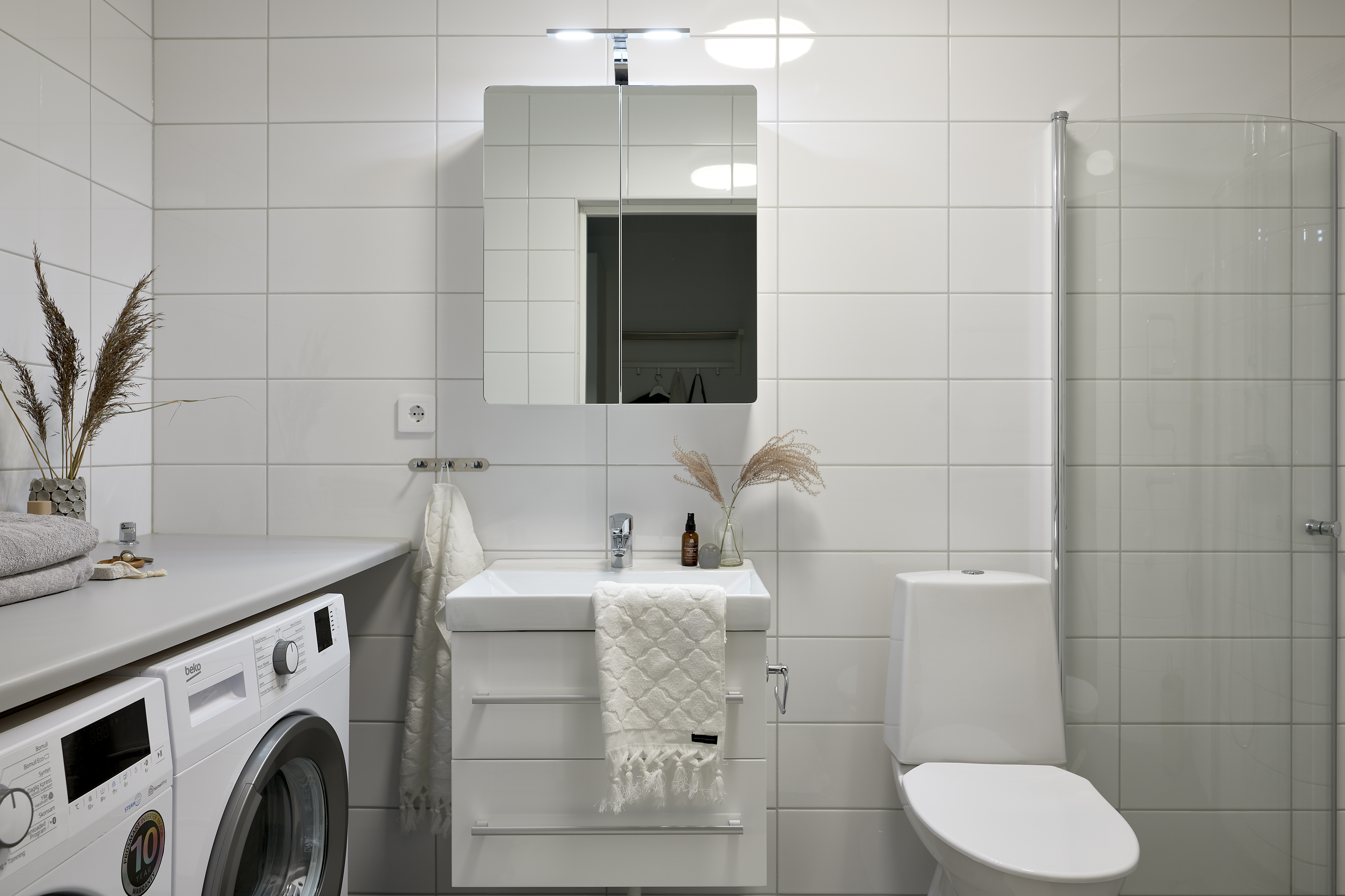 Det helkaklade badrummet är utrustat med dusch med glasvägg, handdukstork samt egen tvättmaskin och torktumlare.