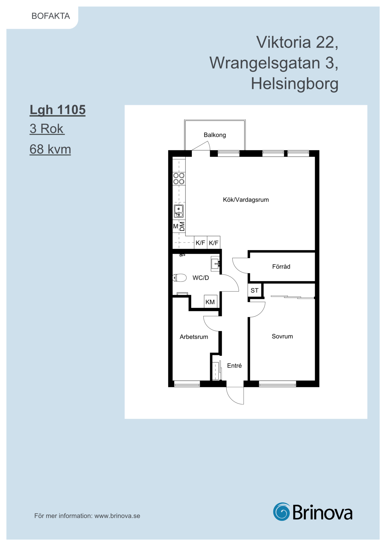 Mysig trerummare på 68 kvm. Sällskapsytor och kök mot Wrangelsgatan där man även når balkongen. Det stora sovrummet har bra med garderobsförvaring som kompletteras med ett invändigt förråd.