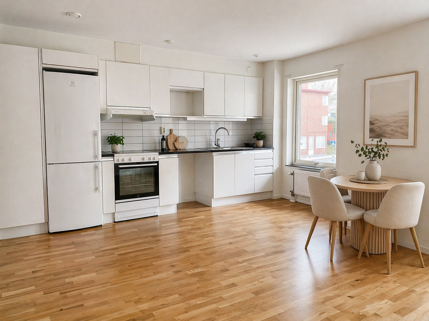 Genomgående hörnlägenhet med uteplats mot innergården. Bostaden har klinkergolv vid entrén som övergår i ekparkett och genomgående vitmålade väggar. Kök och vardagsrum ligger i öppen planlösning och skapar en sammanhängande sällskapsyta. Köket har vit inredning och goda arbetsytor. Badrummet är helkaklat med svart klinker och vitt kakel samt utrustat med dusch, handfat med förvaring, toalett och tvättmöjligheter.